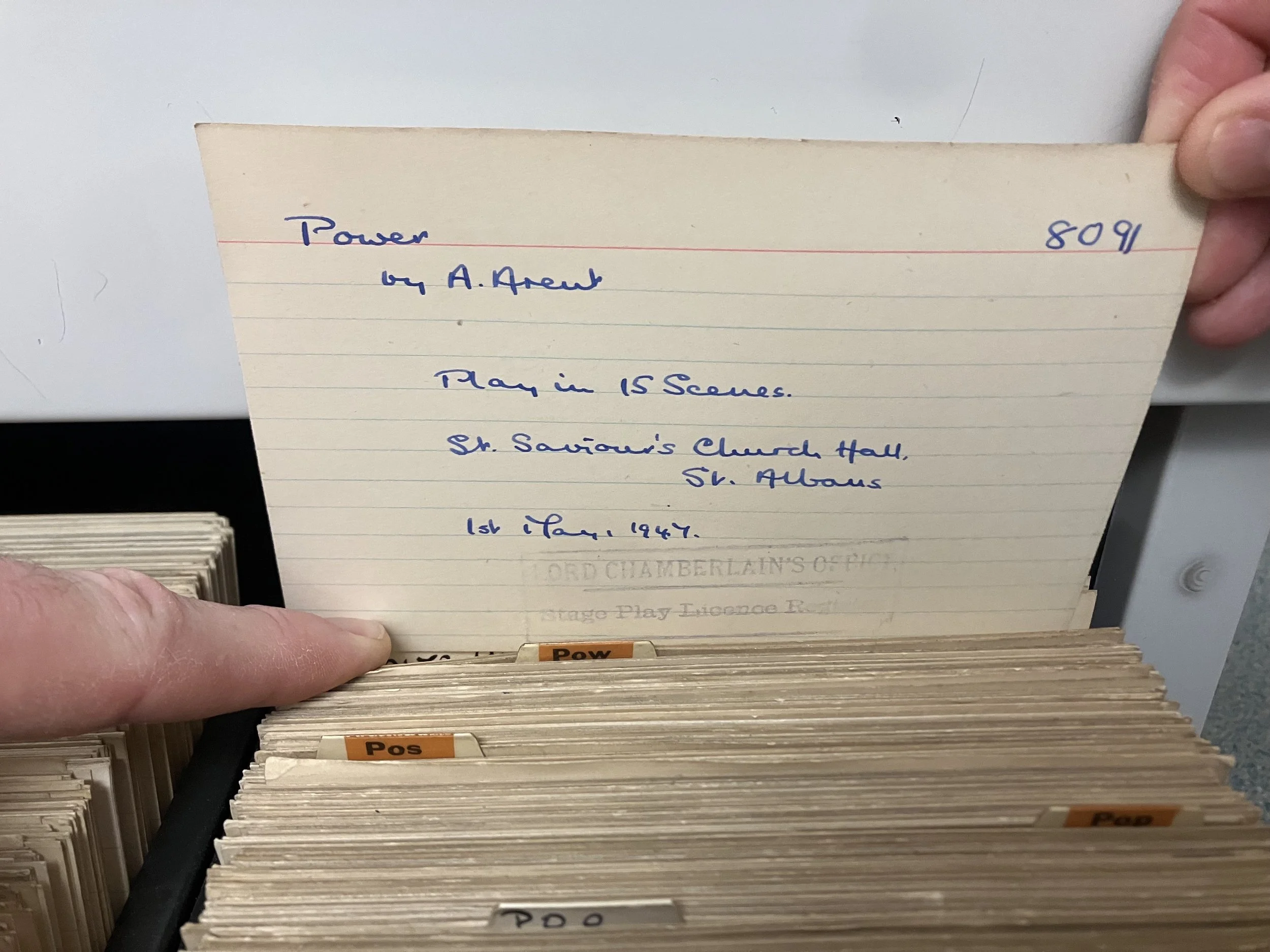 The day is a day of discoveries. Emerging from the Lord Chamberlain’s Collection – navigating volumes and index cards under the enthusiastic and knowledgeable guidance of Alex Lock, Modern Archives and Manuscripts Curator. The blue pen of censorship as the Lord Chamberlain regrets to inform playwrights of their silencing. The instructions described in the readers comments: ‘cut the bum scene.’ Cuts and editing. As this is a collection of plays from Britain’s stages each of us admits to secretly not holding much hope that we’d bring up much from the list of New Deal‘ Living Newspaper’ Plays in this archive but in the stained yellow index cards topped by bold PO font on orange we find POWER.