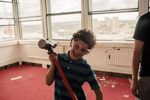 The project ‘Multistory’ took inspiration from the tower’s history as home to BBC children’s television and staged one last epic story for the towers demise. Taking the format of Jackanory as a starting point, a lone celebrity reading a famous story was replaced by locally recruited people from 6 to 80 invited in to sit in an armchair and read from Ted Hughes’ ‘Iron Man’ – a staple text of Jackanory and a tale of destruction and renewal. As people read, a team of children weilding crowbars and sledgehammers from White City Adventure Playground took pleasure in destroying the building around them.